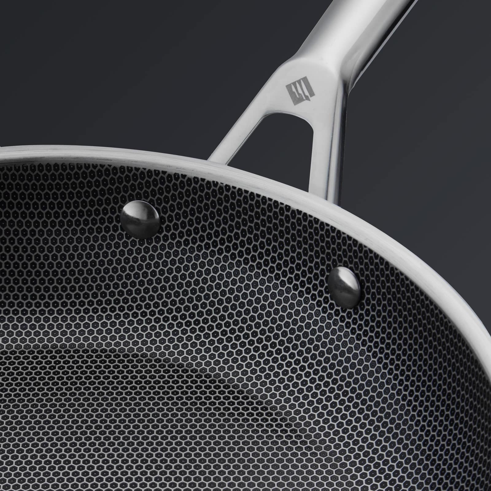 Die Hive Hybrid™ Antihaft-Oberfläche vereint die Widerstandsfähigkeit von Edelstahl mit einer mikrostrukturierten Trennschicht und ermöglicht Ihnen ein sicheres Anbraten, Braten und Bräunen.