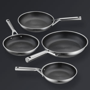 Quatre casseroles. Quatre couvercles. Des performances infinies. Innovation antiadhésive hybride professionnelle dans toutes les tailles : 20 cm, 24 cm, 26 cm et 28 cm. Conçu avec précision à partir d'acier inoxydable 30D avancé avec une surface en céramique Hive Hybrid™ sans produits chimiques. Sans PTFE, PFOA et PFAS. Aucun compromis.